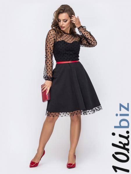 Романтичное платье из костюмной ткани с расклешенной юбкой. Фигурная кокетка и рукав выполнены из фатина в крупный горох. Застёгивается на молнию по спине. Подойдёт для типа фигуры «груша», «перевернутый треугольник» и «прямоугольник».