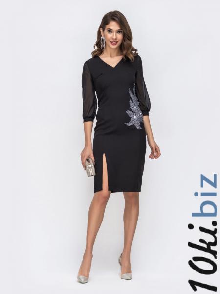 Силуэтное платье-футляр из костюмного крепа с флористической нашивкой на полочке. Изделие в V-образным вырезом горловины и невысоким разрезом. Станет идеальным вариантом для обладательниц типа фигуры «прямоугольник», «песочные часы».