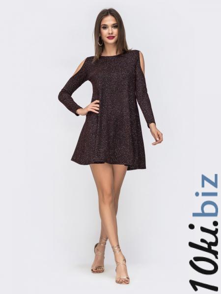 Коктейльное платье-трапеция из блестящего люрекса с открытой линией плеч. Модель визуально удлиняет ноги делая их выразительными. Хорошо подойдёт обладательницам типа фигуры «прямоугольник», «песочные часы».