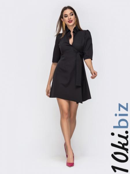 Платье на запах из костюмной ткани, фиксируется поясом. V-образный вырез горловины декорирован оригинальным воланом-стойкой. Хорошо подойдёт типам фигуры «песочные часы» и «прямоугольник».